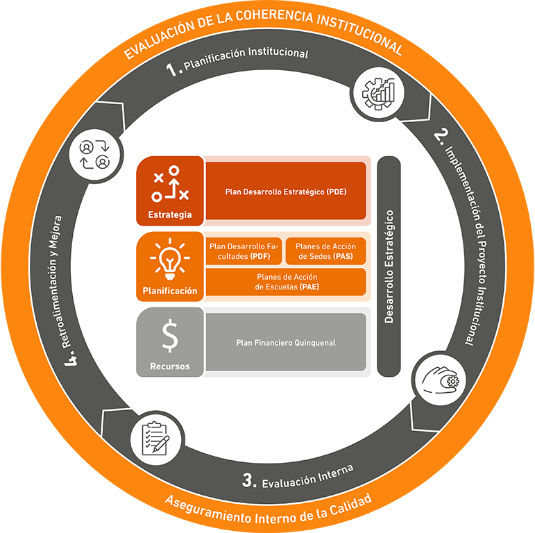 Refiere al cumplimiento de la misión y avance hacia el logro de la visión, conforme a la planificación estratégica institucional. En términos generales, este pilar se constituye en base al aporte de cada unidad, proyecto, programa al logro de la misión, visión y propósitos institucionales establecidos en el PDE. Ello implica, además, articular los propósitos y procesos institucionales, con los objetivos, planes y metas de cada uno de los niveles de la universidad.